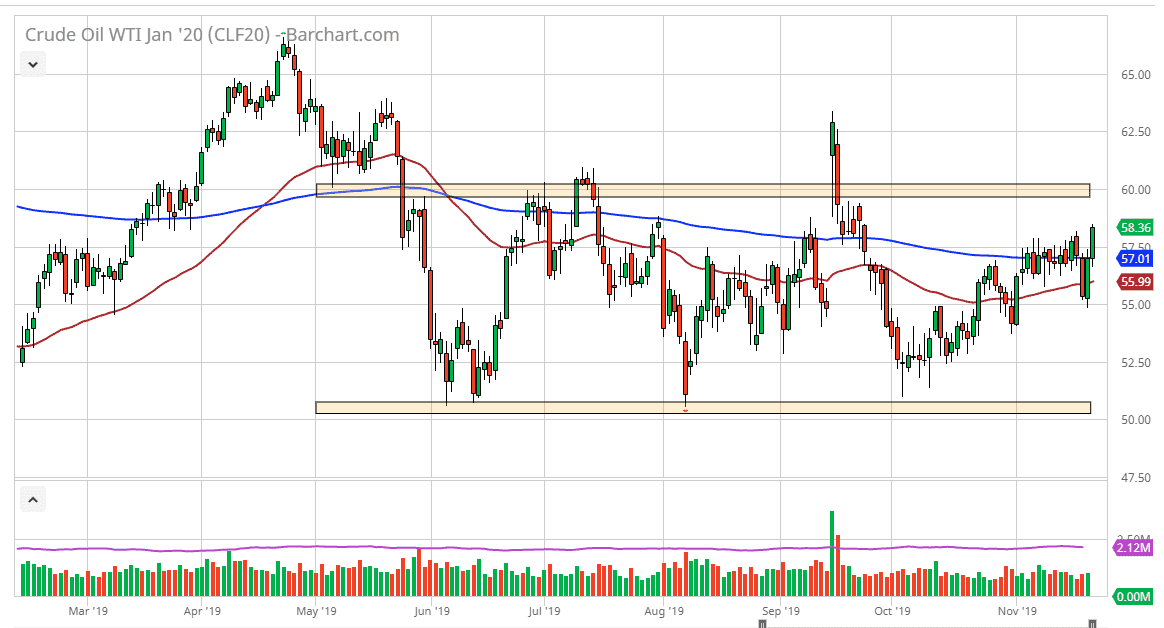 The alternate possibility is that we break down from here, reaching towards the 200 day EMA at the $57 level, and then eventually the 50 day EMA at the $56 level. I do think that it’s only a matter of time before crude oil find buyers on these dips as it is slowly creeping higher. If you squint, you can see that there is an up trending channel that the market has been in, so therefore I think there will be continued pressure to the upside as traders continue to try and pick up value every time it pulls back. If we were to break down below the $55 level could open the door to the $52.50 well but that doesn’t seem to be very likely right now. I think we are simply trying to go to the top of the consolidation range that the market has clearly carved out of the last several months. Ultimately, I think the real fight is closer to the $60 level and I will be watching very closely in that region to see if there is a selling opportunity.