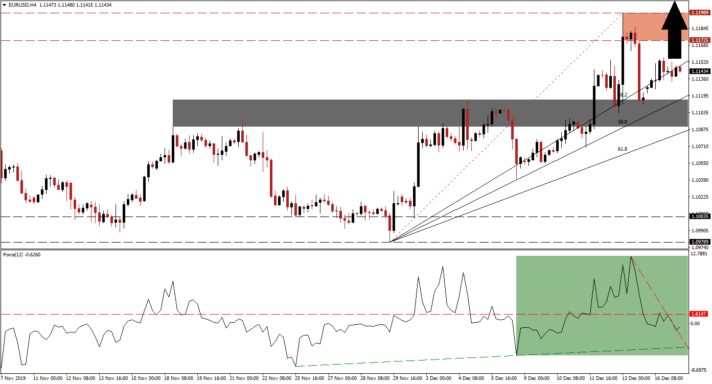 Price action remains additionally supported by the ascending Fibonacci Retracement Fan sequence, which is likely to pressure this currency pair farther to the upside. The breakout in the EUR/USD above its short-term resistance zone converted it into support; this zone is located between 1.10897 and 1.11158, as marked by the grey rectangle, and opened the possibility for a bigger advance. The 38.2 and the 50.0 Fibonacci Retracement Fan Support Levels have already eclipsed this support zone.