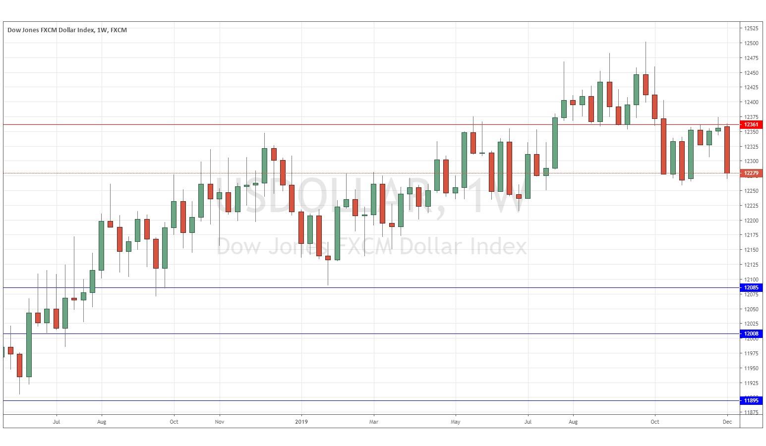 The weekly price chart below shows last week printed a large bearish engulfing candlestick, which rejected the resistance level at 12361, and closed near the bottom of its price range. The price is below its level from 3 months ago, but slightly above its level from 6 months ago. However, it is below the resistance level at 12361. We have a preponderance of mostly bearish signs here, suggesting that next week’s action will be bearish.