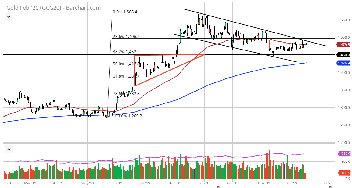 Having said that, the market has to digest the idea of what exactly the agreement is, and quite frankly this point it looks a bit underwhelming. However, the fact that the tariffs were delayed and avoided over the weekend should be somewhat bullish for equities, and negative for gold. It should have more of a “risk on” feel, but there is a significant amount of support underneath at the $1450 level. Breaking below there would be a major breach of support, but I think in the short term we are simply going to go back and forth in this general vicinity as we are getting close to the end of the year, and therefore a lack of volume in trading. With that in mind, gold can have sudden moves but the best way to trade it during this time year is to simply pay attention to this to levels, and trade accordingly if we can break out of this short-term range. Expect a lot of choppiness.