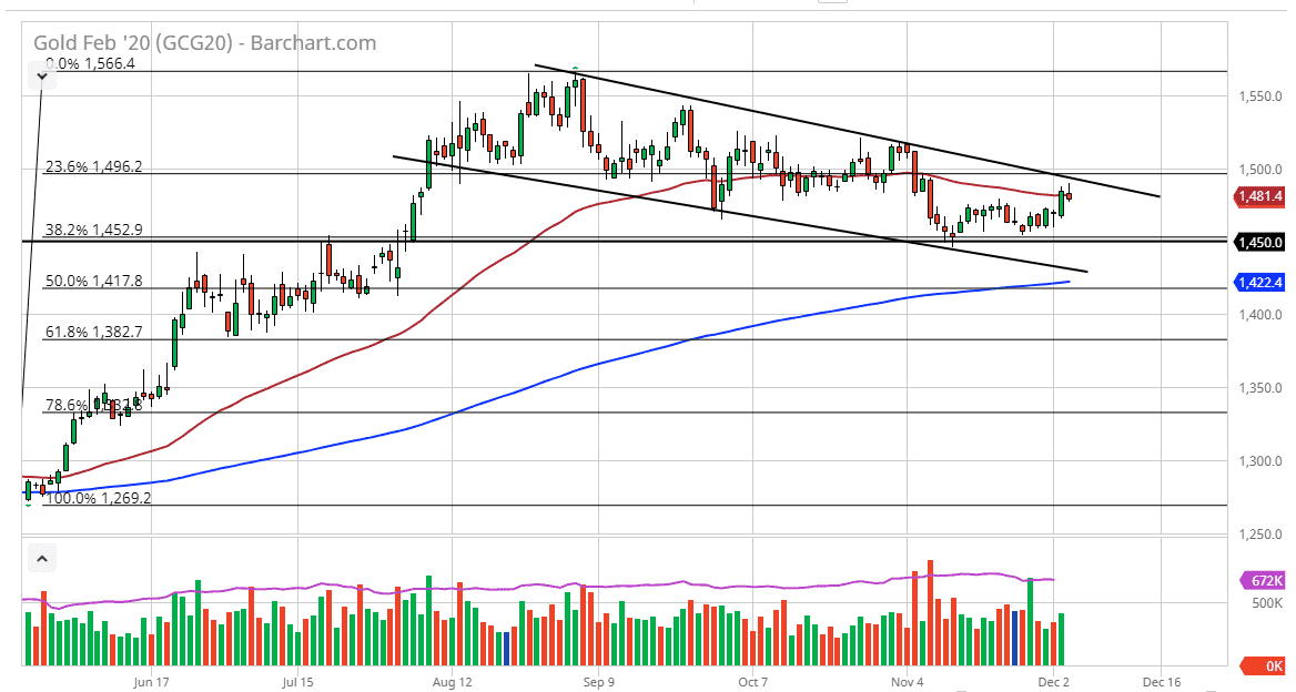 Gold markets initially tried to rally during the trading session on Monday, but then on Wednesday turned around to show signs of exhaustion at the top of the downtrend channel that we have been in. Beyond that, the 50 day EMA looks as if it is offering resistance as well, and the shooting star candlestick of course is negative. Furthermore, above there, meaning the top of the candlestick, the $1500 level looms large as resistance.