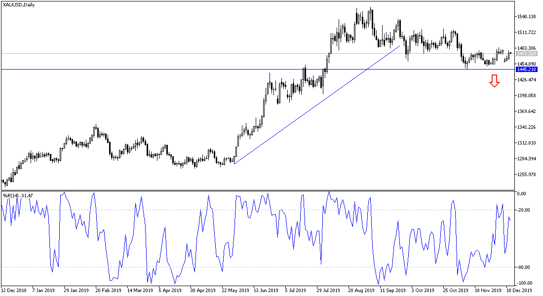After completing the reaction from the announcement of the US Central Bank about its monetary policy decisions, the gold price awaits important events, most notably the reaction from the results of the first meeting of Christine Lagarde as President of the European Central Bank, along with the beginning of voting in the general elections in Britain, which will determine the fate of Brexit, in addition to learning about the decision of whether the US will impose higher tariffs on other Chinese imports, or not, as it is scheduled to do so on December 15. The price of gold went higher to reach the $1479 resistance before settling around $1474 at the time of writing.