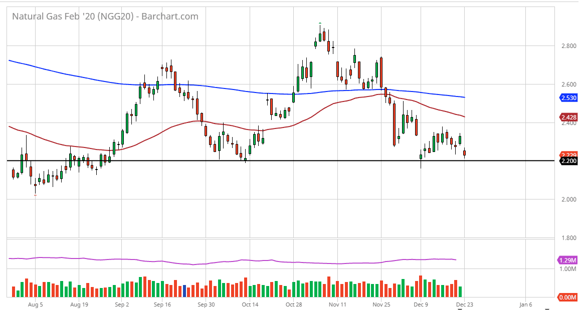 Natural Gas gapped lower to kick off the trading week on Monday, as we again have seen a lot of bearish pressure into this marketplace. While I still expect some type of spike higher during the winter, it is obvious that even with bullish storage numbers last week, natural gas simply cannot pick itself up at this point. In fact, I suspect that this is going to be a horrific 2020 for natural gas suppliers, as the drilling of natural gas in the United States had been 17% more than the previous year.