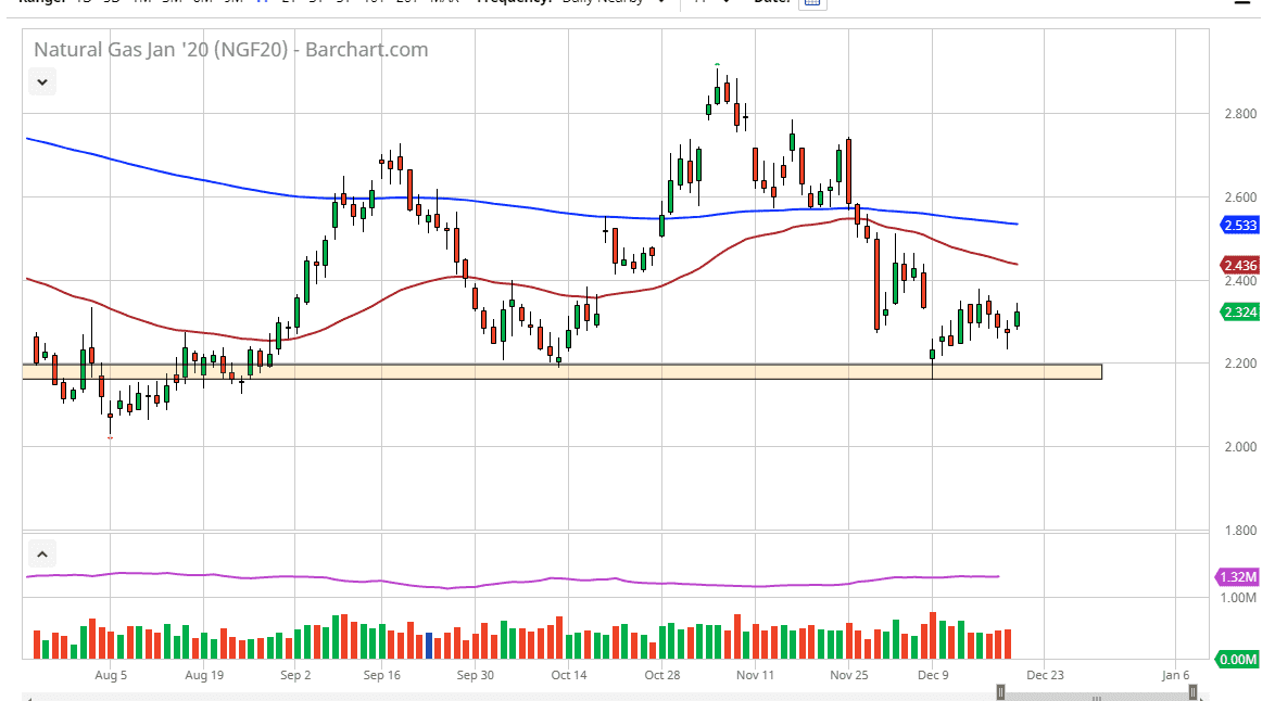 In fact, I believe that the real story here is going to be that the natural gas markets are going to stay extraordinarily weak over the course of 2020. I believe that the real money is probably made shorting natural gas stocks, because natural gas suppliers are going to get absolutely crushed unless we work through some supply this winter. So far, we have just now had a bullish inventory report. Looking at this marketplace, it’s obvious that the support underneath at the $2.20 level should be rather crucial, but ultimately this is a market that has formed a bit of a double bottom and now it looks as if it is trying to support that concept going forward. That being said, if we were to break down below the $2.20 level, the market probably breaks down to the $2.00 level and this of course would be catastrophic for the market as we continue to see a lot of lackluster performance here. In fact, in general natural gas is to be sold on rallies but this time year is typically a bit more bullish because of the cold temperatures in places like Boston, Philadelphia, Cleveland, and New York City.