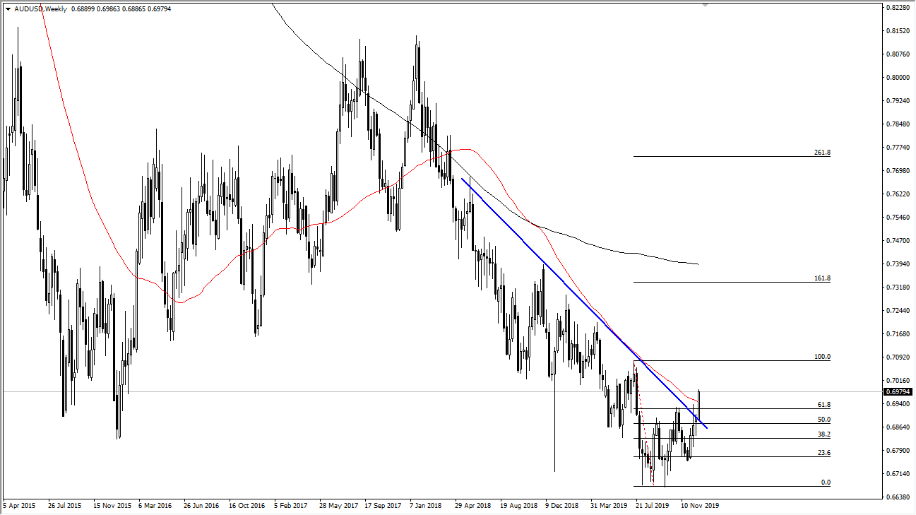 The Australian dollar has exploded to the upside during the previous week, breaking above the 61.8% Fibonacci retracement level. At this point, I think that we are getting very close to a longer-term move to the upside, especially if the United States and China will go ahead and sign some type of agreement. The Australian dollar is highly sensitive to the situation, and therefore the better things go there, the better things go here. I like the idea of buying short-term pullbacks in this pair, because it’s very rare that a market simply breaks out above a major downtrend line and keeps going. I anticipate that a move back towards the 0.6940 level will start to attract buyers and offer value.
