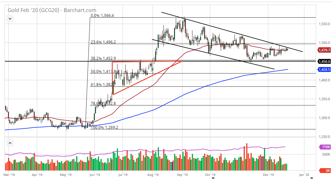 That being said, a headline isn’t that much to ask out of the market considering just how nervous most people are right now. If we get a negative US/China headline, then it probably sends gold much higher. Otherwise, if we get an extraordinarily bullish headline, then it’s likely that the gold market will fall towards the support level underneath near the $1450 level. That is also the 38.2% Fibonacci retracement level, and therefore it should be paid close attention to. We are trading at the 50 day EMA and have the 200 day EMA coming up to this level. That being said, this is a market that is going to be extraordinarily thin so any moves that are done due to algorithm traders picking up headlines will probably be somewhat exaggerated. With that in mind, a lot of professional traders will simply be sitting on the sidelines for the next week or so. However, the technical analysis does suggest that the market is ready to drift lower based upon the downtrend line. It doesn’t necessarily set up for some type of major sell off, just that we are probably going to have a little bit of resistance. With that being the case, short-term I am probably slightly negative on gold but don’t expect much over the next couple of days. The most important thing to keep in mind is that it’s holiday trading, so you should probably focus on your family and friends more than markets but if you do get involved here you should play very small positions as the danger will be rather high. Yes, it’s great that you can get big move is based upon a headline, but those moves cut both ways.