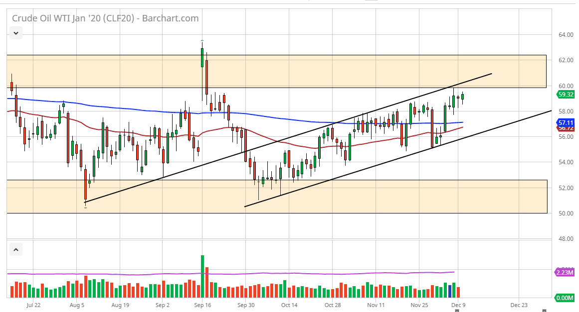 We are still technically in an uptrend and channel, and therefore it’s likely that the market will find plenty of buyers underneath. If we do break above the $62.50 level, then it opens up the door for a much bigger move. Alternately, if crude oil was to break down below the moving averages it’s likely that we would reach down towards the $52.50 level which extends resistance all the way down to the $50 level underneath. At this point, I think the one thing you can count on is a lot of choppiness and noisy trading. That being said it seems as if the market is more tilted to the upside, and I think that comes down to waiting on the decision about the December 15 tariffs and whether or not they are implemented against the Chinese.