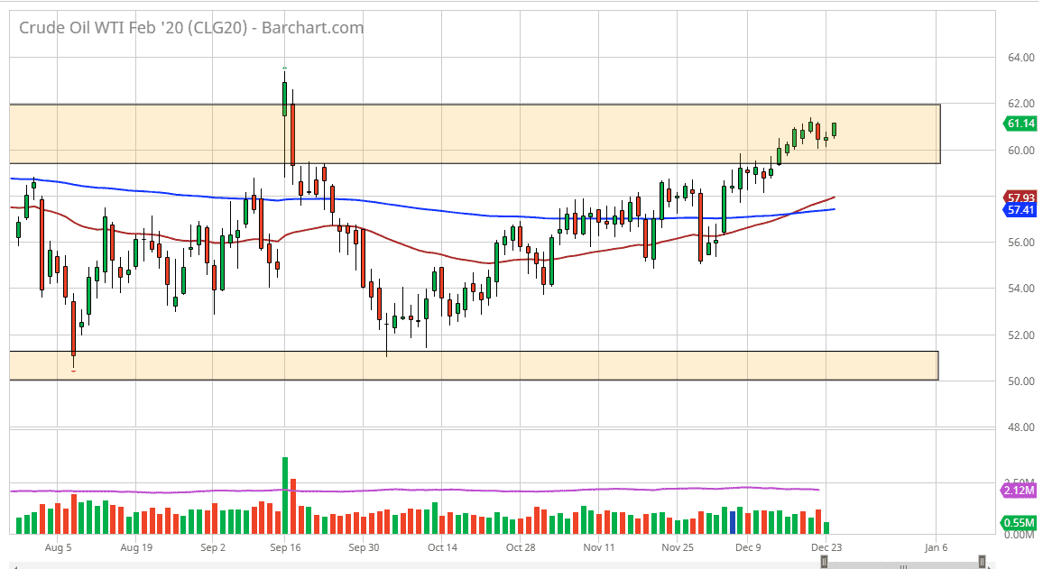 The West Texas Intermediate Crude Oil market has rallied significantly during Christmas Eve, showing signs of extraordinarily bullish pressure again. At this point, the $62 level above will be targeted for a potential break out, and eventually we should in fact see that. That being said though, I had anticipated a pullback in order to take advantage of value when it occurs, but at this point it seems very unlikely to occur based upon what we have seen. Ultimately, if the market can break above the $62 level, then the market is likely to go much higher, perhaps reaching towards the $65 level. All things being equal, a lot of this comes down to a couple of external factors.