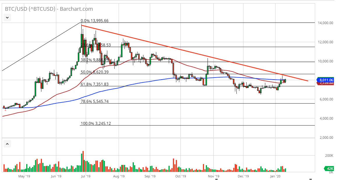 Bitcoin markets rallied a bit during the trading session on Friday, reaching towards the highs of the Thursday session. We are currently testing the shooting star from the Wednesday session that was so negative, and perhaps even more importantly, the 200 day EMA. Bitcoin has been in a downtrend for quite some time so it would make quite a bit of sense to see a continuation of that negativity. Furthermore, if we break down below the 50 day EMA it will more than likely go down towards the lows again.