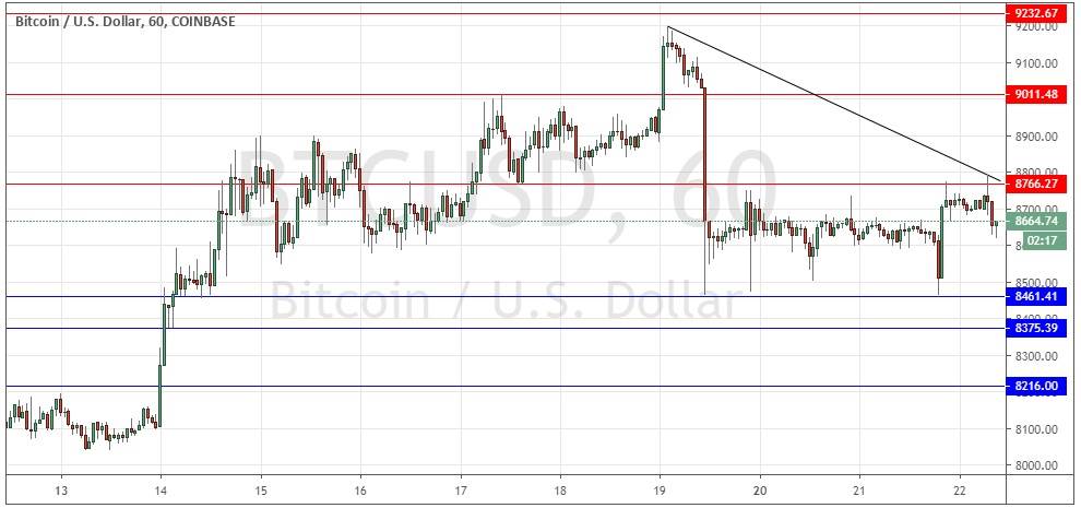 Yesterday’s signals produced a short trade from the recent bearish rejection of the resistance level identified at $8,766 which is in a small amount of floating profit at the time of writing, but it does not look like a very high-probability trade so it may be wise to take the risk off the trade by closing part of the position for profit.