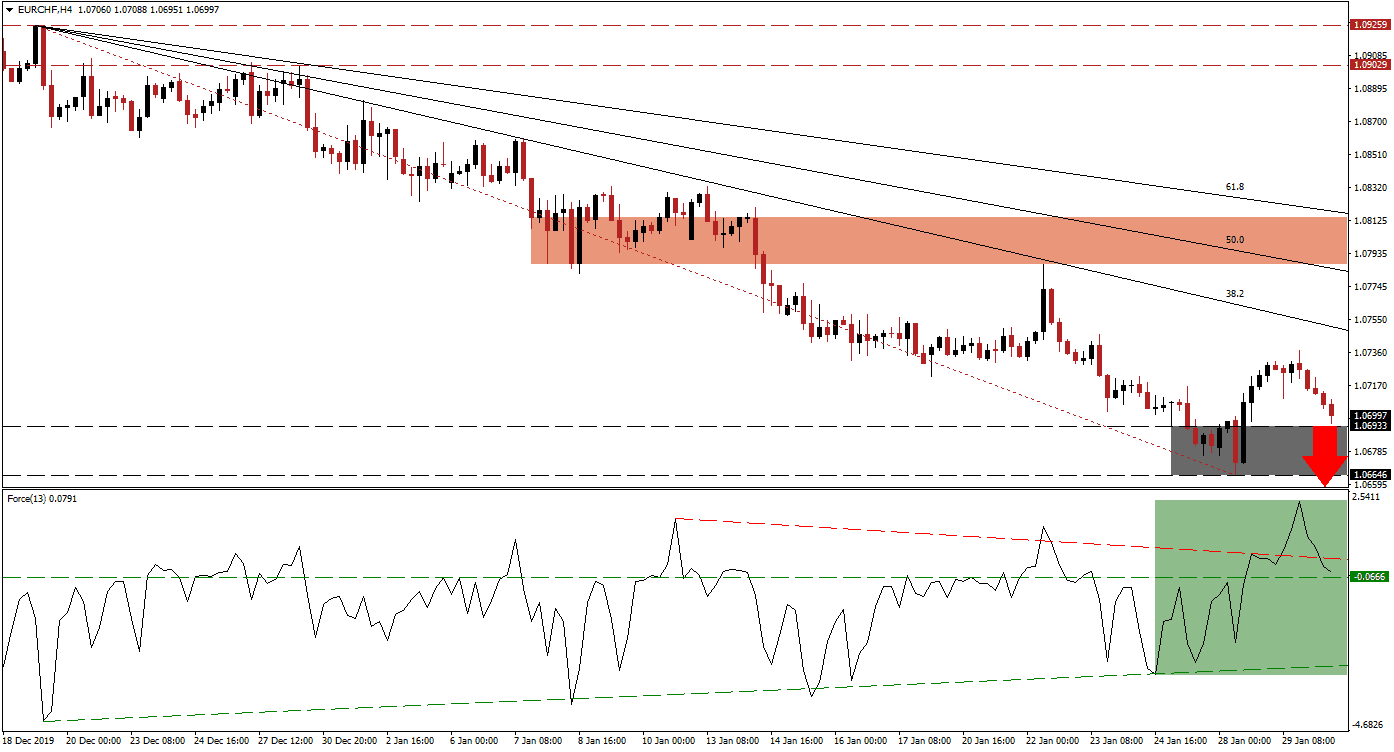 With global growth concerns dominant, a breakdown in the EUR/CHF below its support zone located between 1.06646 and 1.06933, as marked by the grey rectangle, is anticipated. The Eurozone is confronted with problems on multiple fronts, applying downside pressure on already depressed economic growth. Price action is positioned to extend its series of lower highs and lower lows, which should take this currency pair into its support zone between 1.04933 and 1.05295. You can learn more about a support zone here.