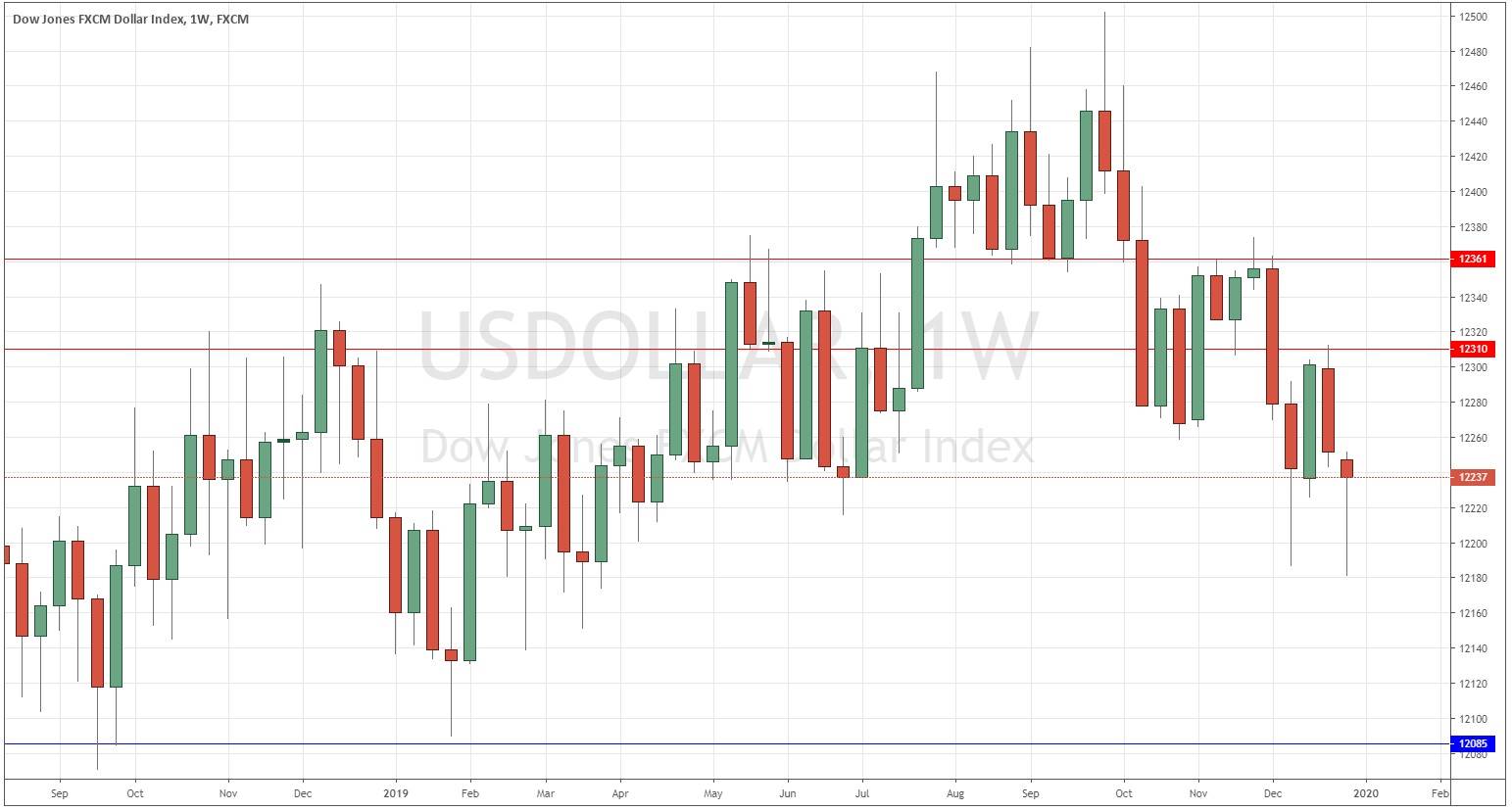The weekly price chart below shows last week printed a bullish pin candlestick, which closed near the top of its price range. This is a weakly bullish sign, but the price is below its levels from both 3 and 6 months ago, which indicates a long-term bearish trend. The price is well below the key resistance level at 12310. We have mostly bearish signs here, but the short-term bullish action makes this week’s direction hard to predict.