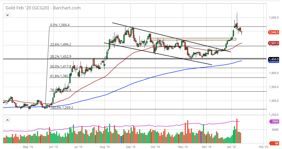 At this point, if we were to break down below the lows of the Tuesday session, then I think we will be looking at the $1525 level, perhaps even the 50 day EMA underneath there which is currently at the $1507 level. Either way, I don’t have any interest in shorting this market, because it has been so strong. When you look at the recent move, the fact that we have pulled back so drastically isn’t much of a surprise, considering that it was pretty much parabolic. With that being the case, I am a buyer above the $1550 level, but I think what I will probably do is build up the position relatively small.