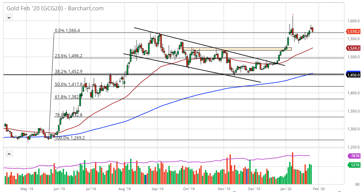 The 50 day EMA is closer to the $1525 level and sloping higher. The $1550 level is an area that has a lot of support built in due to the fact that it is a large figure, but it is also where we have bounced from previously. At this point, the market is likely to continue to go looking towards the $1600 level over the longer term, which has been significant resistance. If we can break above there, then the market is very likely to continue to go towards the $1650 level.