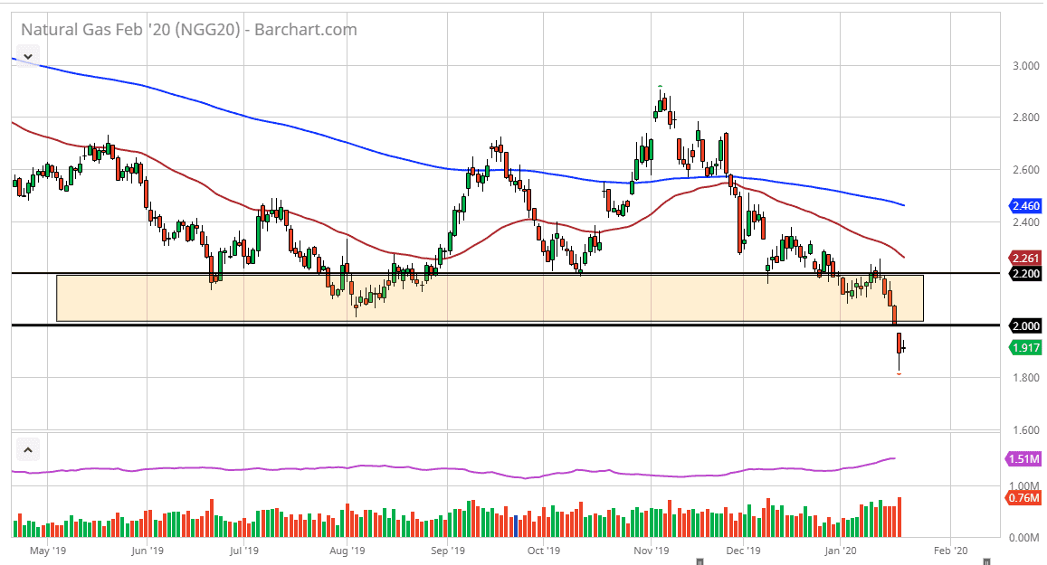 Alternately, if we do break down below the bottom of the candlestick for the trading session on Wednesday, then the market will break the $1.80 level and look towards the $1.75 level next. While it certainly can happen, it is very difficult to sell a breakdown at this point, rather than to sell into rallies as there has been a significant amount of bearish pressure to begin with. At this point, it’s likely that we will see signs of exhaustion as an opportunity, so at this point if it’s only a matter of time before we get one of those. I don’t like fresh selling at this point, because when you get this cheap in a market, eventually you get some type of massive turnaround. At this point, I’m going to step to the sidelines and wait for a nice opportunity to start selling. The 50 day EMA is starting to reach towards the $2.20 level, that should also offer a bit of resistance as well. The market simply cannot seem to pick up and go higher at this point, at least not for any significant amount of time and as the oversupply continues to be a major issue.