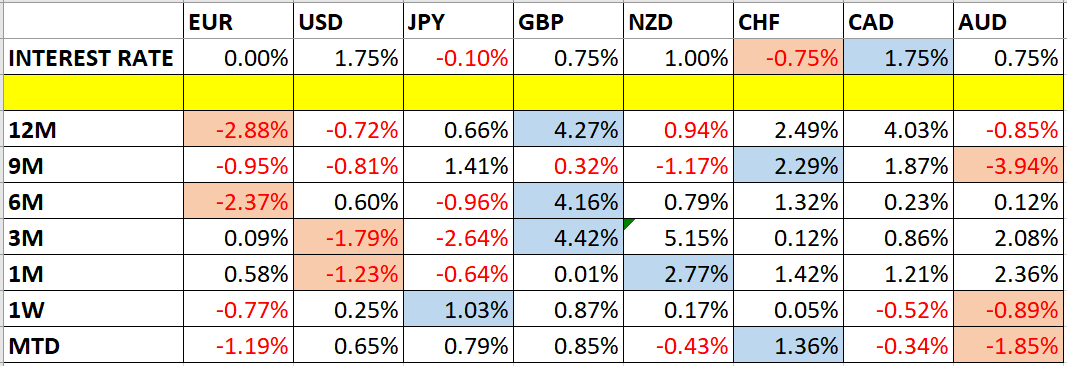 Let’s look at the relevant data of currency price changes and interest rates to date, which we compiled using a trade-weighted index of the major global currencies: