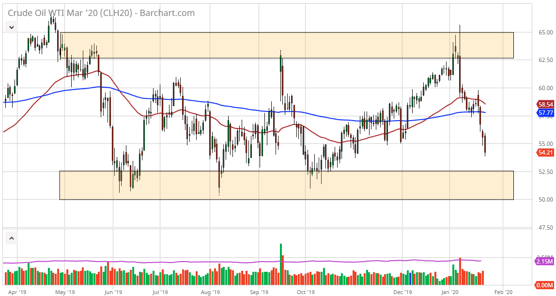 I believe that the market is going to turn around somewhere near the $52.50 level, and I will use a daily close on the chart to decide when it’s time to start buying. If we do in fact have that happen, it will be time to start buying as it would be a continuation of the overall consolidation that the market has been in for months. Although we are at extraordinarily low levels, the reality is that we are still well within the range of trading that we have been in, so therefore I do not have any concerns about some type of massive meltdown.