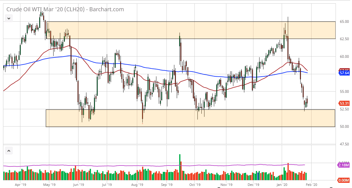 The West Texas Intermediate Crude Oil market has initially gapped higher to kick off the trading session on Wednesday, only to turn around and reach towards the bottom of the overall consolidation range that it has been in for some time. We are trading at the very bottom of the longer-term range, and therefore it makes sense that a little bit of a bounce may occur. In fact, that’s essentially what I am banking on at this point, as the $52.50 level should continue to offer support that runs down to the $50.00 level. As a result, I believe that a bounce to the $55 level is very likely, based upon simple structural support. Further compounding this idea is the fact that we had fallen to this area so quickly, and therefore it’s difficult to imagine that the market is simply going to slice through the support level without at least having a bounce or two in the process.