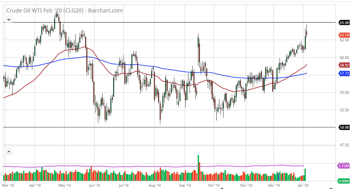 Crude oil markets have been very strong over the last couple of trading sessions after the United States killed a top ranking Iranian general. However, at the first signs of serious trouble we have seen the market rollover again. The fact that the WTI market could not break above the $65 level is somewhat telling, because we are still recognizing the previous resistance barriers. If tensions rising in the Middle East cannot drive prices higher, and we have been repulsed so drastically by this level, this tells me that there is underlying weakness when it comes to this market.