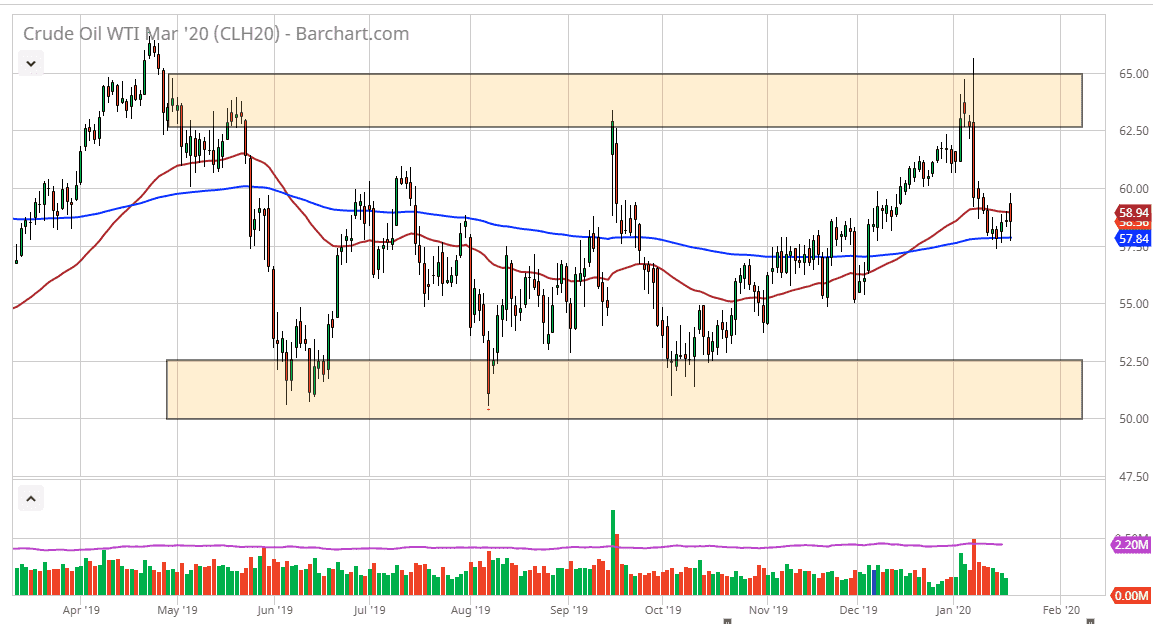 The bigger picture is that we have been consolidating between the $65 level and the $50 level over the last several months. In other words, it would not be a huge surprise to see this market continue to drift lower, and while it may feel very negative in the short term, the reality is that it would be a simple continuation of the overall range bound trading that we have seen for some time. At this point, the market looks as if the 50 day EMA is ready to break down below the 200 day EMA, showing signs of negativity as well. Furthermore, the candlestick looks very negative from the trading session, showing signs of conviction to the downside as we are closing towards the bottom of the longer range. The fundamental situation continues to be one that sees a serious lack of demand in general, but at the same time OPEC is looking to cut production. It’s obvious that the market is going to continue to see a lot of volatility, but I think we need to make a return to the downside before we can bounce again. The best way to trade this market is probably going to be selling it from a short-term perspective on signs of failure.