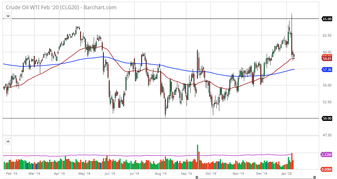 The impulsive reaction to the killing of the Iranian general sent the oil market into overdrive, but then broke down rather significantly as tensions fell off. At this point now, we can start to look at the fundamental picture, which was grinding higher before all of that noise. We are currently trading right around the $59 level, an area that should continue to attract a bit of attention based upon the moving average as well. All things being equal, I do think that the market goes higher, but it’s going to take work to get back up to those higher levels. However, if we break down below the 200 day EMA, it opens up the door down to the $52.50 level. At this point, wait for a break above the top of that hammer from the Thursday session in order to go long. Otherwise, look for price action at the 200 day EMA to take advantage of. As far shorting is concerned, if we do give up the 200 day EMA, I would become aggressively short and sell every time it rallies and show signs of exhaustion. Obviously, if tensions flare up again in the Middle East, it could put a turbocharged in the move higher.