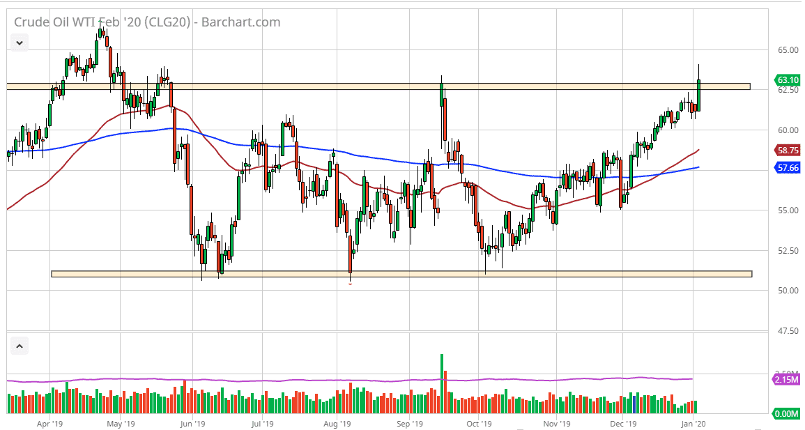 The West Texas Intermediate Crude Oil market has broken higher during the trading session on Friday, reaching above the $62.50 level. By doing so, it is a strong sign but honestly, I find more telling is the fact that an Iraqi general was killed, and although oil shot higher, it did not completely break out above this resistance. This to me tells just how concern the market is about oversupply. There seems to be a significant resistance barrier between $62.50 and $65.00 above, so I think at this point it’s not until we break above the $65 level the people can take this breakout seriously. As we have rallied a bit but gave back a lot of the gains just above that level, it shows that there is no significant momentum to follow through, at least not yet.