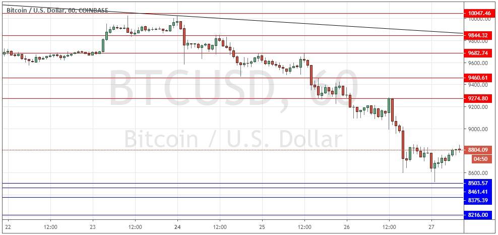 Yesterday’s signals produced a losing long trade from the bullish bounce rejecting the support level identified at $8,683.