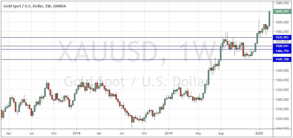 Gold in U.S. Dollar terms just made its highest weekly close in seven years. The weekly candlestick was very large and closed very close to its high. These are all bullish signs, and the price looks likely to rise further over the coming week.