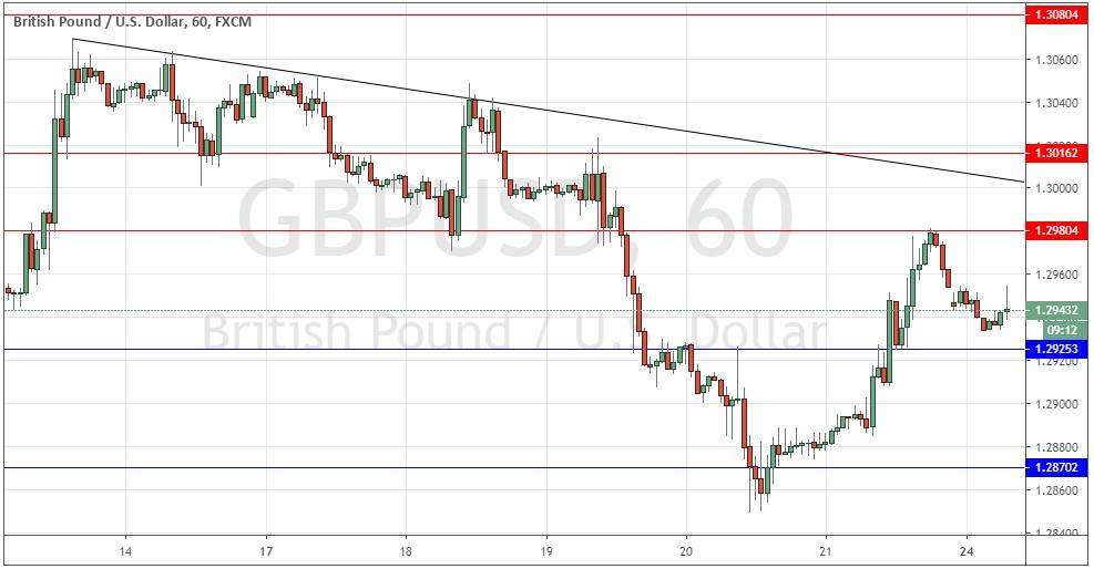 The U.S. Dollar is broadly strong, so it is interesting that we see it making not such strong progress against the GBP, which reveals a little strength in the GBP. Nevertheless, the picture is at least weakly bearish, with the bearish descending trend line shown in the price chart below keeping the price below the 1.3000 area. For this reason, I think the most interesting trade which might set up today would be a short trade from either of the two nearest resistance levels, as they are somewhat confluent with both this trend line and the big round number at 1.3000. So, I would take a bearish bias today if we get a bearish reversal at either 1.2980 or 1.3016.GBPUSDThere is nothing of high importance due today concerning either the GBP or the USD.