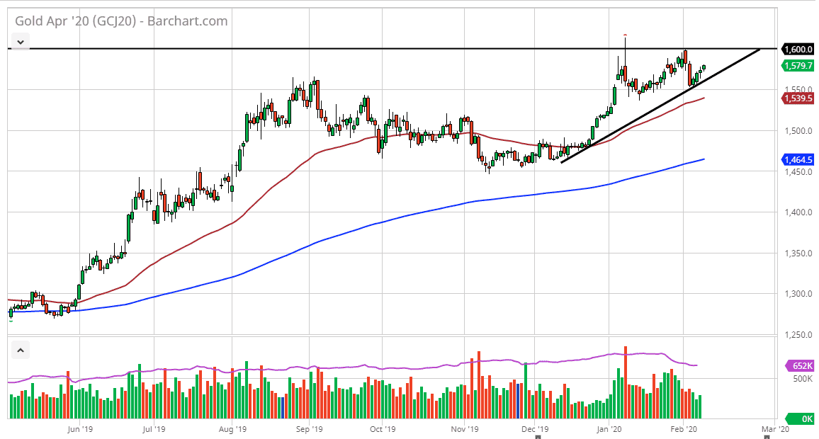 Keep in mind the gold markets were rising before a lot of the coronavirus concerns came to the forefront anyway. This means that the coronavirus is simply the latest reason to get long on safety currencies and trades. In other words, this is simply the latest excuse to go long. After all, the global growth was slowing down heading into this event and central banks around the world were continuing to loosen monetary policy. With that being said it’s very likely that we will continue to see gold rise regardless of the coronavirus, but quite frankly it’s just more fuel to the fire. Having said all of that, the $1600 level has been very difficult to break above, and I suspect that it won’t be done easily. However, I do expect it to happen relatively soon, as concerns around the world are increasing, not falling.