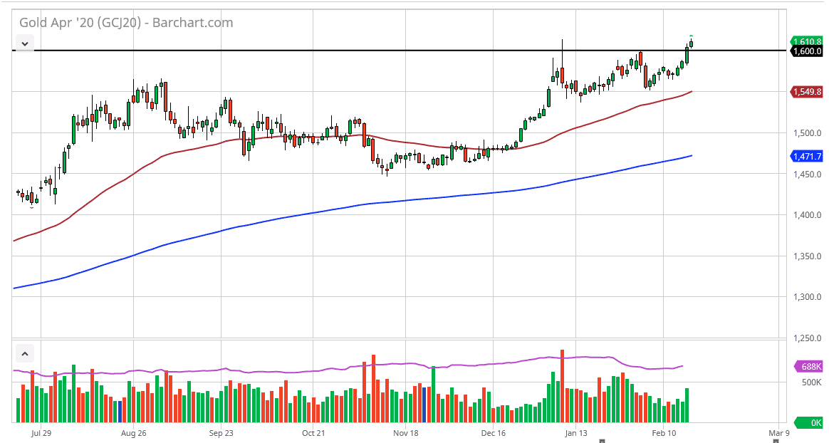 Furthermore, the coronavirus continues to grab the headlines and people of course are concerned about that. With that in mind it makes quite a bit of sense that the gold markets get a bit of a safe haven bid. This is especially telling considering that the US dollar has also been rallying, and therefore it shows just how concerned the world is right now. Typically, if gold rallies it works against the value of gold, but at this point it’s all about fear more than anything else. Now that the market has shown quite a bit of strength and has broken above the most recent high, it’s very likely that the market will go looking towards the $1800 level longer-term but it’s probably going to take some time to get there.