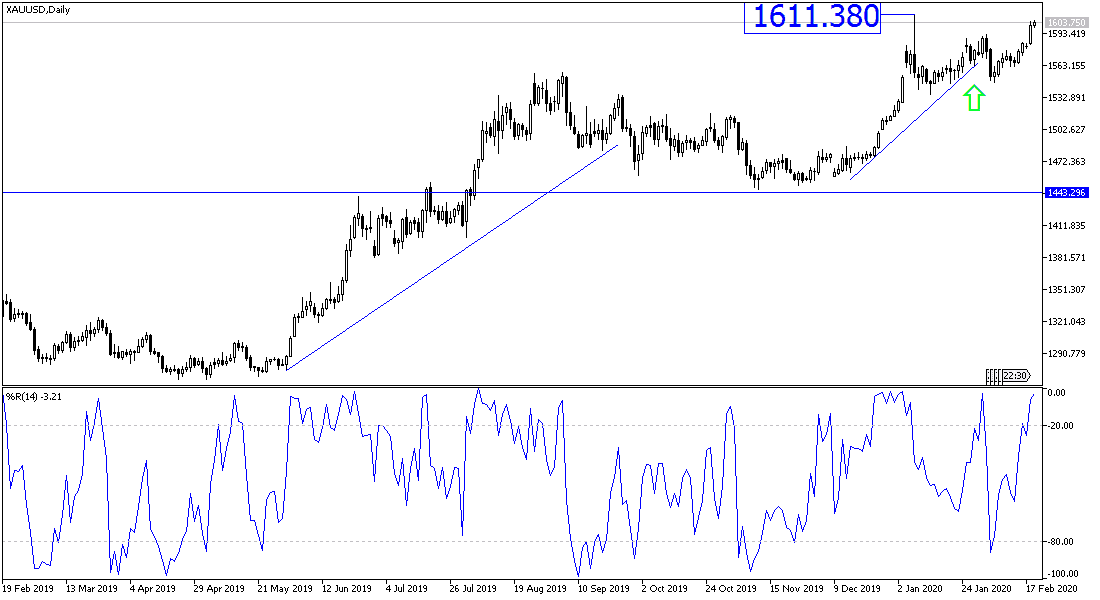 It was natural for gold prices to continue to rise, especially with the persistence of global concerns about the continued outbreak of the Chinese Corona pandemic and its negative impact on the future of global economic growth. The price of gold jumped to the $1605 resistance, the highest for gold in seven years. We noted a lot in the recent technical analyzes that gold may return to move towards the $1611 resistance, which was recorded in the first hours of trading in 2020.