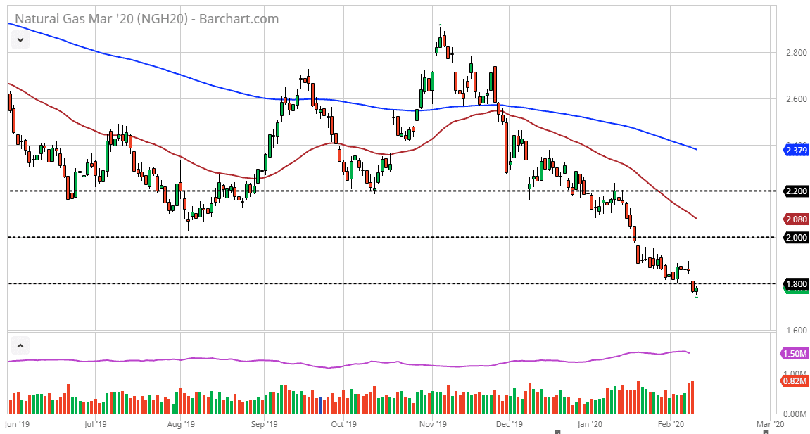 The fundamentals continue to work against natural gas, as it is extraordinarily oversupplied at the moment, and there’s no sense in trying to fight this overall trend. Furthermore, whether reports for the end of February suggest that it is still going to be warm, and therefore demand in the United States will continue to drive. Beyond that, the Chinese economy is certainly slowing down as well, as one would have to think that demand for natural gas products is dropping over there also. Quite frankly, the last thing that the natural gas market needed was warmer temperatures to drive down demand even further in what is an oversupplied market to begin with. Going forward, there will be bankruptcies, and those bankruptcies should help, but it’s going to take quite some time for that to happen.