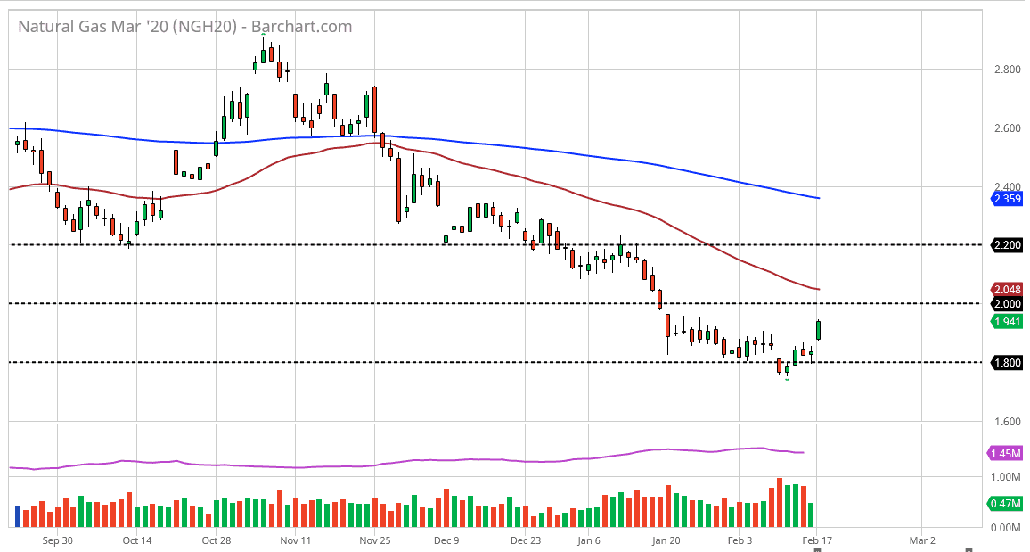 Natural gas markets have gapped to kick off the week on Monday, reaching well above the $1.90 level. That is a very bullish sign, but ultimately this is a market that is in a major downtrend and this will not have changed regardless of the massive move higher. At this point, the $2.00 level will offer a significant amount of psychological resistance, just as the 50 day EMA is approaching that level. At this point, it is more than likely going to continue to be a market that has sold every time it rallies, because quite frankly the natural gas markets are extraordinarily oversupplied.