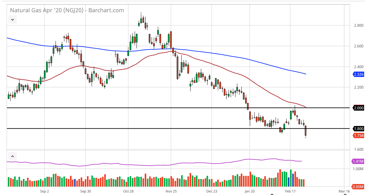 The natural gas markets have broken down significantly during the trading session on Thursday, slicing through the $1.80 level. Beyond that, it now looks as if we are going to settle on a fresh, new low on the daily chart, but at this point it’s likely that we have further to go due to the fact that we had an extreme miss when it comes to the inventory figures during the day. Originally thought to be a -158 billion, the Natural Gas Storage figures in the United States came out at -143 billion, showing less demand than anticipated. The last thing that the natural gas markets needed was to see less demand coming out of the US.
