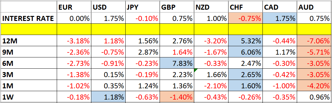 Let’s look at the relevant data of currency price changes and interest rates to date, which we compiled using a trade-weighted index of the major global currencies: