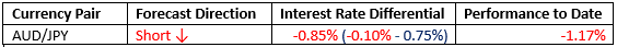 For the month of February, we forecasted that the best trade would be short AUD/JPY. The performance to date is as follows: