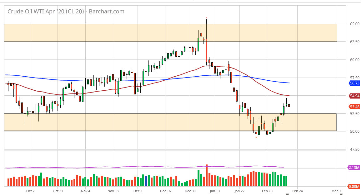 If we do break down below the hammer from the trading session on Friday, then it probably shows that the market is going to go down into that $2.50 level between the $52.50 level and the $50.00 level. Ultimately, this is a market that continues to show a lot of back-and-forth, but it should be noted that as soon as the fears of coronavirus aside, it’s very likely that crude oil will rally. The market breaking down below the lows that were recently made would be a very negative sign, probably based upon an acceleration of the concerns around the world. This is a market that is highly sensitive to China as we have recently seen estimates that demand coming out of China would drop at least 20% in the short term, possibly even further if this doesn’t subside.
