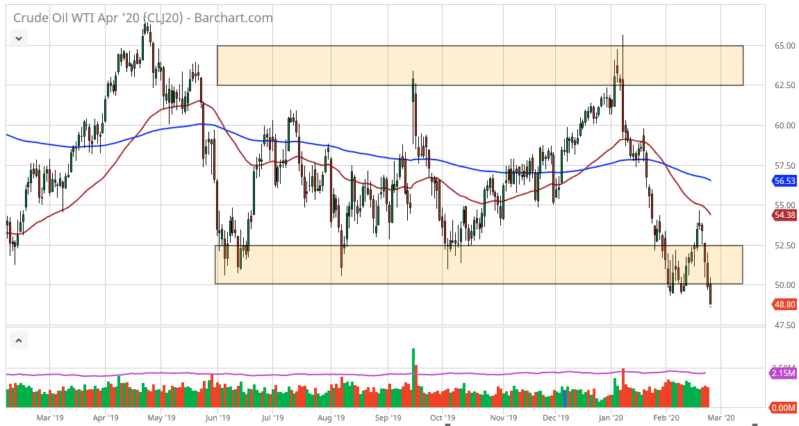 Rallies at this point should continue to see resistance between the $50 level and the $52.50 level above there. That is a thick area of noise, so I think it’s very likely that the sellers will be sitting there. The 50 day EMA is starting to break towards the $52.50 level, so beyond that it’s also resistance. This is a market that has certainly made its statement during the day on Wednesday, even though the inventory number came out better than anticipated. All things being equal, this is a market that looks like it’s ready to go much lower and has broken through the bottom of what could be thought of as a bearish flag. If that’s the case, then it’s very likely that the market could go as low as $35, based upon the measurement. I’m not necessarily calling for that, but it is something that you need to keep in the back of your mind. Regardless, this is a market that cannot be bought at this point, and not until the coronavirus situation gets under control. As we are nowhere near that, it remains very bearish looking to say the least and therefore it’s a scenario where trying to catch a falling knife can get you hurt rather quickly.