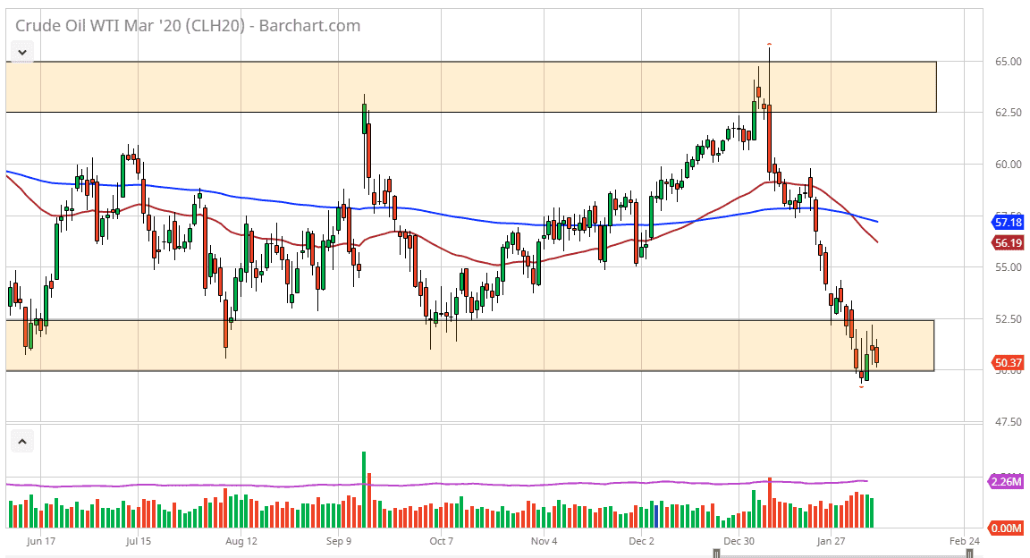 The crude oil markets have taken it on the chin over the last several weeks, falling from $65 after the killing of Gen. Soleimani in Iraq. Since then, the market has dropped $15 which is a huge move in just a few weeks. That being said, there are a multitude of reasons why the markets continue to sell crude oil, not the least of which would be the issues in China. Chinese demand is expected to be down at least 20% if not more, and that of course is going to have an influence on pricing crude oil as China is the largest consumer of the commodity in the world.