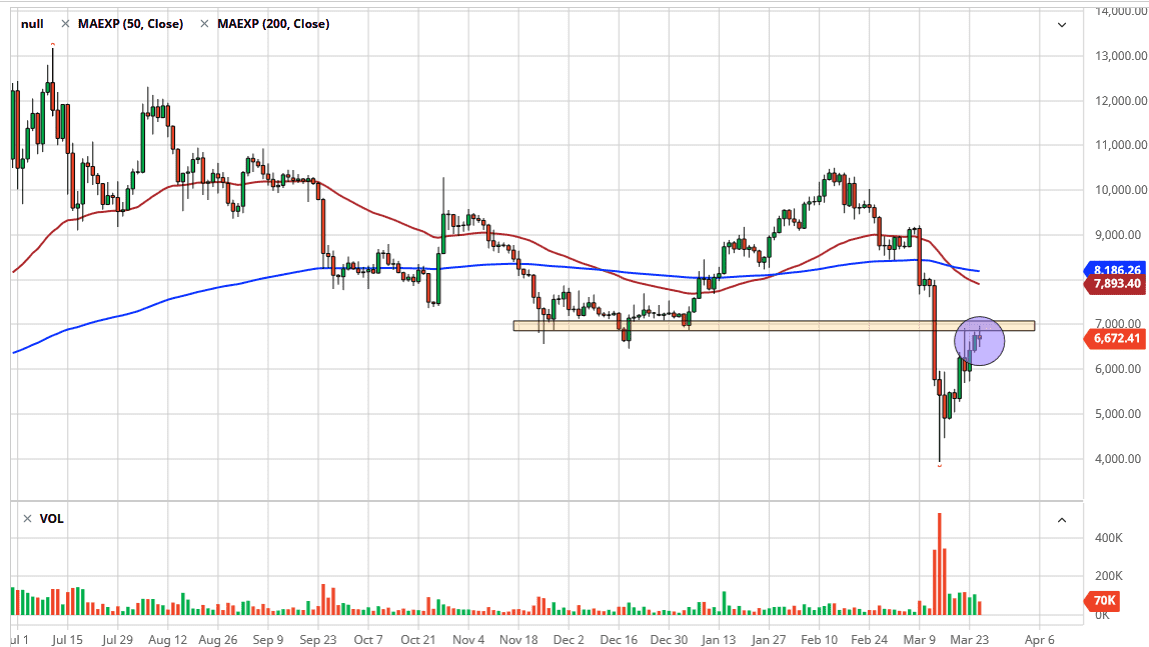 If the market were to break above the $7000 level, then it’s very likely that the 50 day EMA above will very possibly be resistance as well, and most certainly the $8000 level will be. Ultimately, I think that Bitcoin is going to continue to struggle, because in a world where the U.S. Congress and the Federal Reserve are pretty money out of thin air and doing massive amounts of stimulus, Bitcoin not been able to rise significantly tells you just how negative this trend is. Ultimately, if the market does rally from here, I suspect it’s not until we clear the 200 day EMA on a daily close that the longer-term trend will be positive. Until then, rallies are to be sold and even though we’ve had a nice little run over the last five or six sessions, when you look at the last month or so, you can see that it is yet just a bounce that seems to be running out of momentum. Even if the market were to turn around and rally significantly, the reality is that between now and then it’s very likely that the market will fall in order to find a retest of the lows as it is quite common in these significant bearish markets. Finding some type of solid base will be the best thing that Bitcoin can do, as the market matures, it starts behaving much more like a mature market.