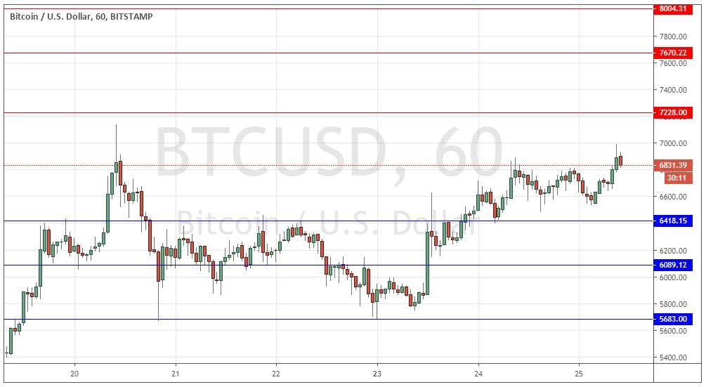 I wrote yesterday that I would take a weakly bullish bias today if we had gotten a bullish bounce from a pullback to the support level at $6,418. This could have been a good call as the price has continued to rise, but unfortunately the price never quite reached that support level.