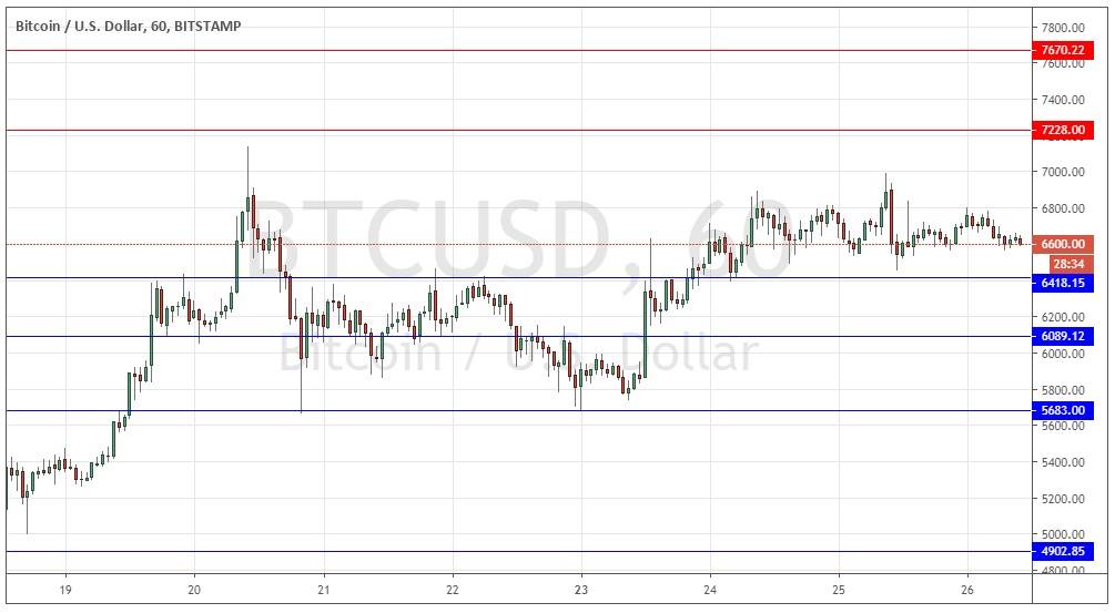 I think a neutral approach should continue here today with no directional bias – so I would take either a long trade at a bounce from $6,418 or a short trade from a bearish reversal at $7,228.