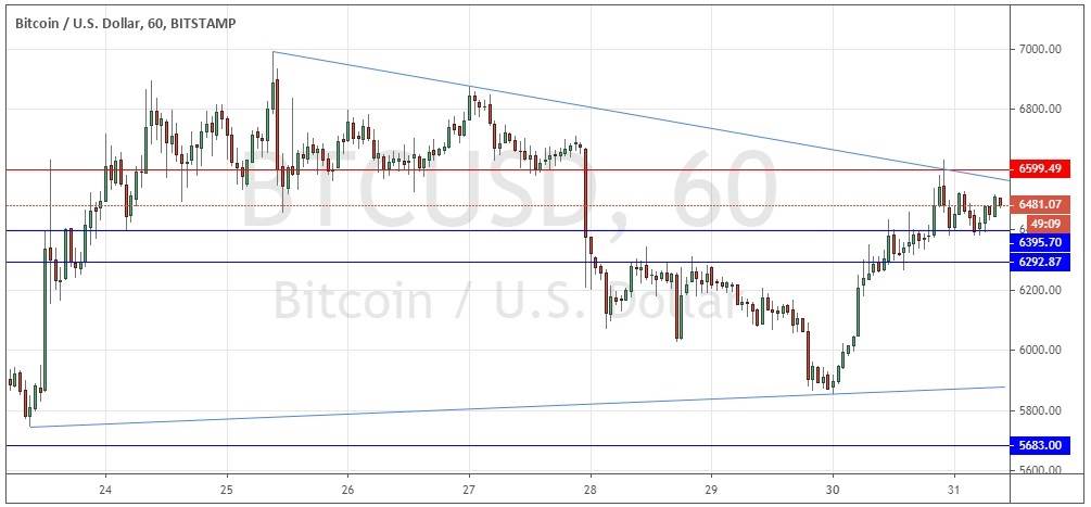 I think we could see a bearish reversal from $6,600 but I would be prepared to take a bullish bias if we get two consecutive hourly closes above that level later today, as it would probably signify a breakout.