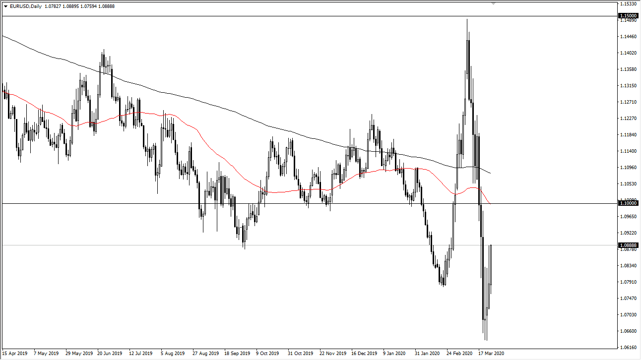 All of that being said, the candlestick for the trading session was pretty impressive, so it does suggest that we have a little bit more follow-through to the upside coming. Short-term traders may wish to take a long position to aim for the 1.10 level, but I do expect a lot of resistance in that general vicinity. At this point, if we get some type of exhaustion candle in that region, I am more than willing to start selling because it makes sense based upon the longer-term trend. However, with the noise that we have seen it’s important to keep your position size relatively small, because the volatility has been so over the top. We are jumping around based upon the latest headline, so therefore keeping your trading account safe is your most important job right now.