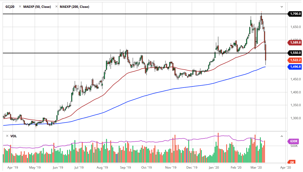 At this point, gold is being sold off due to the fact that traders are having to cover losses in other markets. The massive margin calls that we have seen in other markets. As they sell gold to capture some gains in order to cover those horrific losses. At this point, gold is sitting just above the 200 day EMA and that will attract a certain amount of attention due to the fact that it also is the $1500 level. I think it is very possible that we will find some type of support in this general vicinity.