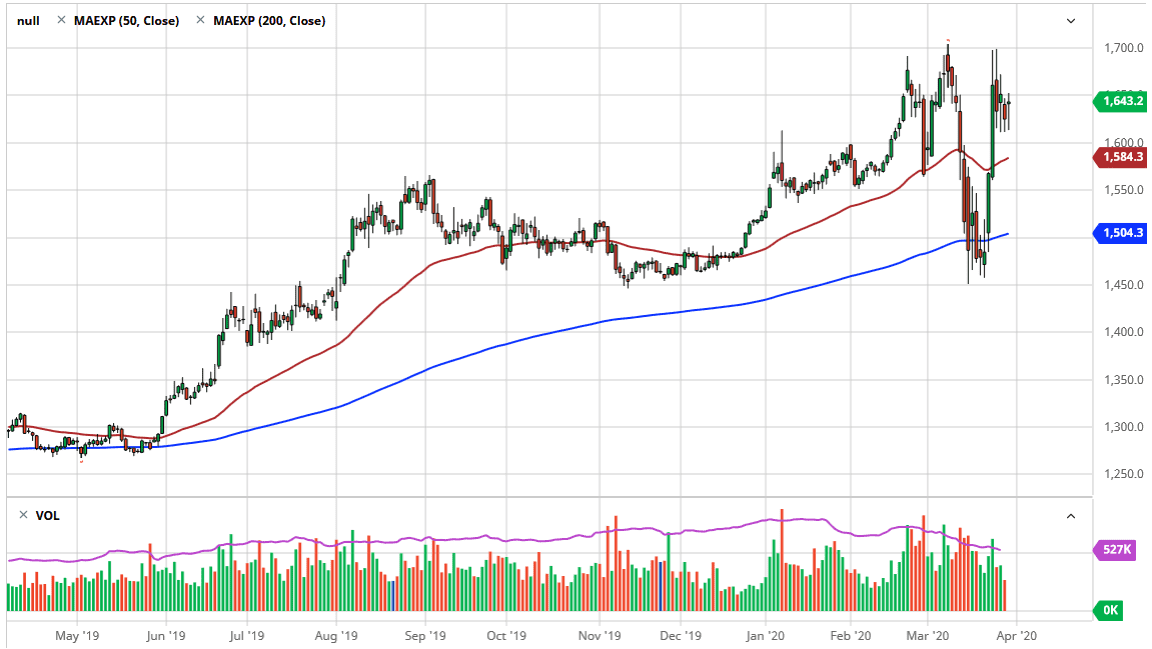 Gold markets have gone back and forth during the trading session on Monday, showing signs of noise. At this point I think that the market will continue to see the $1650 level as resistance, and if we can break above there it’s likely that the market will then try to go to the upside. At that point I would anticipate that the market goes looking towards the $1700 level, an area that has caused a bit of resistance more than once. If we break above that, then we can continue the longer-term uptrend towards the $1800 level, finally then focusing on the $2000 level which is my longest term target.
