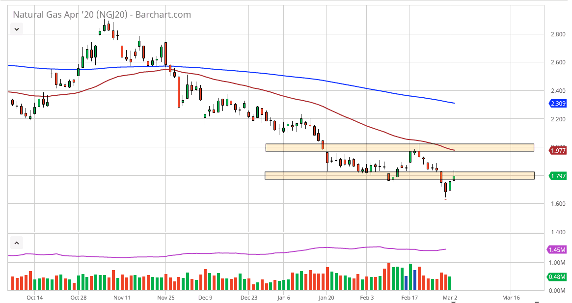 The natural gas markets as rallied during the trading session on Tuesday, reaching as high as $1.85 before pulling back. At this point, the market is likely to see more selling coming, because the natural gas markets are oversupplied, and that is going to continue to be a major driver of what happens in this market. Even if we were to break above the top of the candlestick for the trading session on Tuesday, then I think it’s simply a matter of waiting for higher levels to show signs of exhaustion so that we can sell from those higher levels. There is no scenario in which I am willing to buy natural gas, as although we have bounced a bit, we are still very depressed as far as price is concerned.