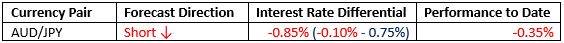 For the month of March, we forecasted that the best trade would be short AUD/JPY. The performance to date is as follows: