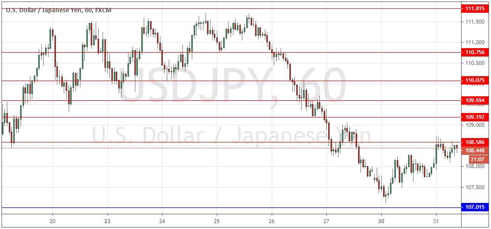 I do not see any great trading opportunities as likely to set up here, even though today is the last day of the month at the end of an extremely volatile month. I would stand aside and wait to see what happens for the time being unless there is an exceptionally attractive bearish price action rejection of 108.59 at about the time markets in New York open.